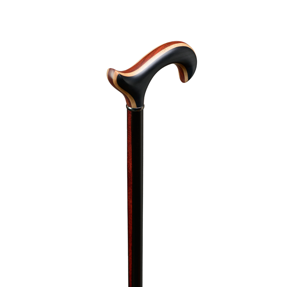 מקל הליכה אלגנטי בעבודת יד משילוב עץ איכותי - מייפל, פאדוק ואבוני, עם טבעת ניקל שחורה ועיטור פסים מרשים