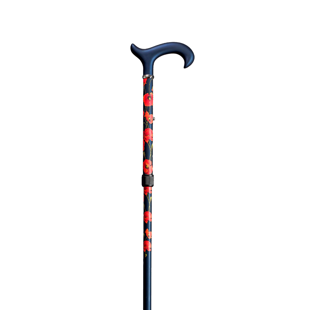 המקל מתכוונן לגובה באמצעות מנגנון כפתור לחיצה, ומעוצב בגימור מט עם דוגמת פריחת פרג בגווני כחול כהה ואדום.
